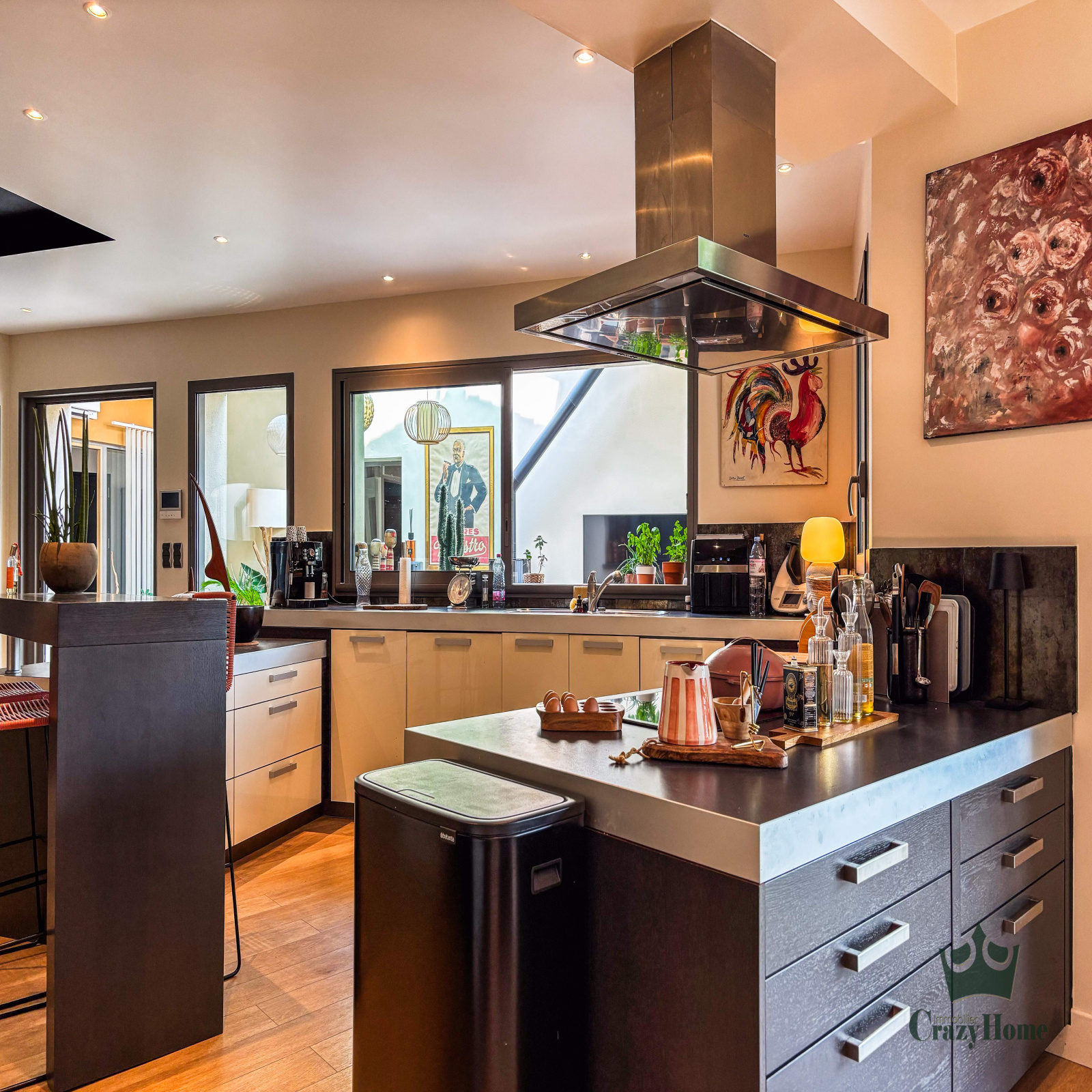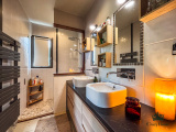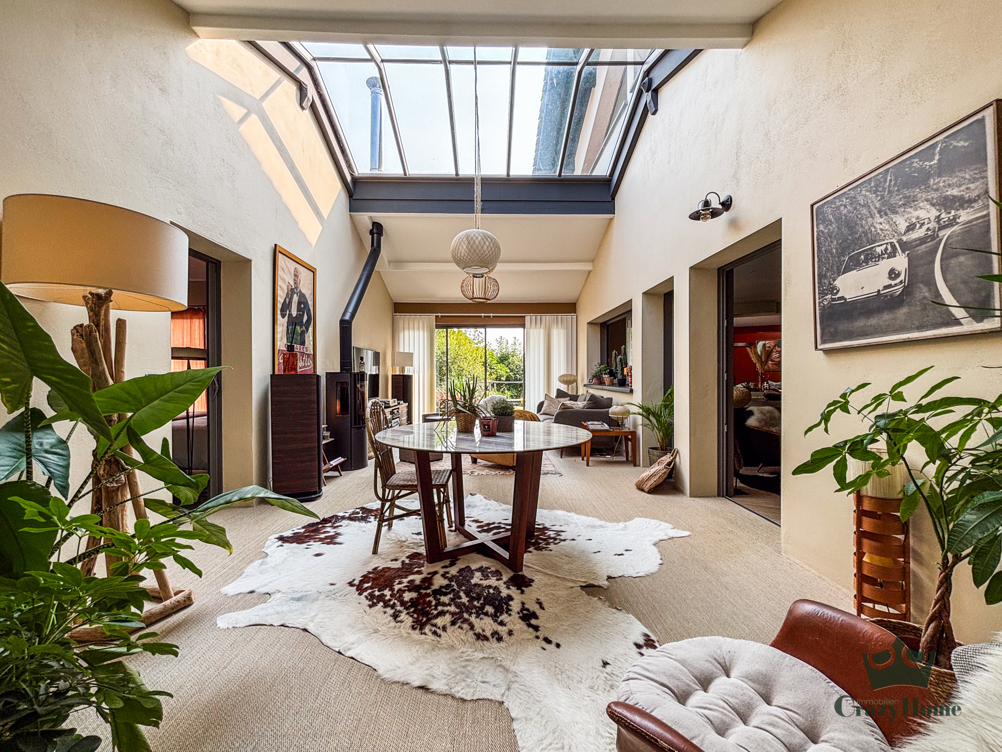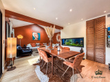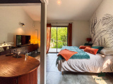 Côté intérieur : deux espaces de vie, dont un salon d'hiver très lumineux agrémenté d'un poêle pour réchauffer les soirées d'hiver et un salon "cosy" face au jardin ; entre les deux, une cuisine de type américaine très conviviale. 4 chambres en suite avec chacune leur salle d'eau, wc et dressing, pour le confort de toute la famille et des invités.