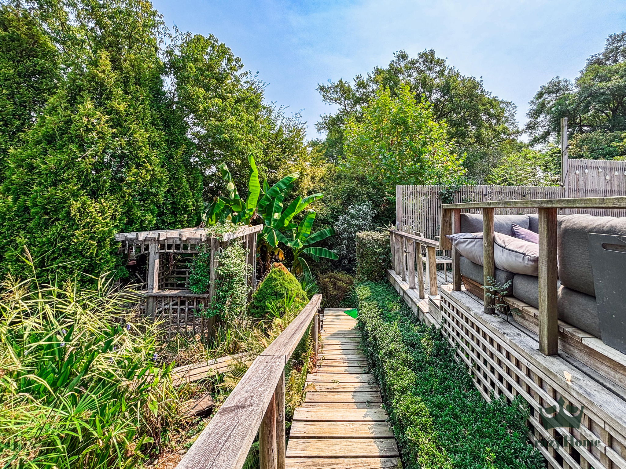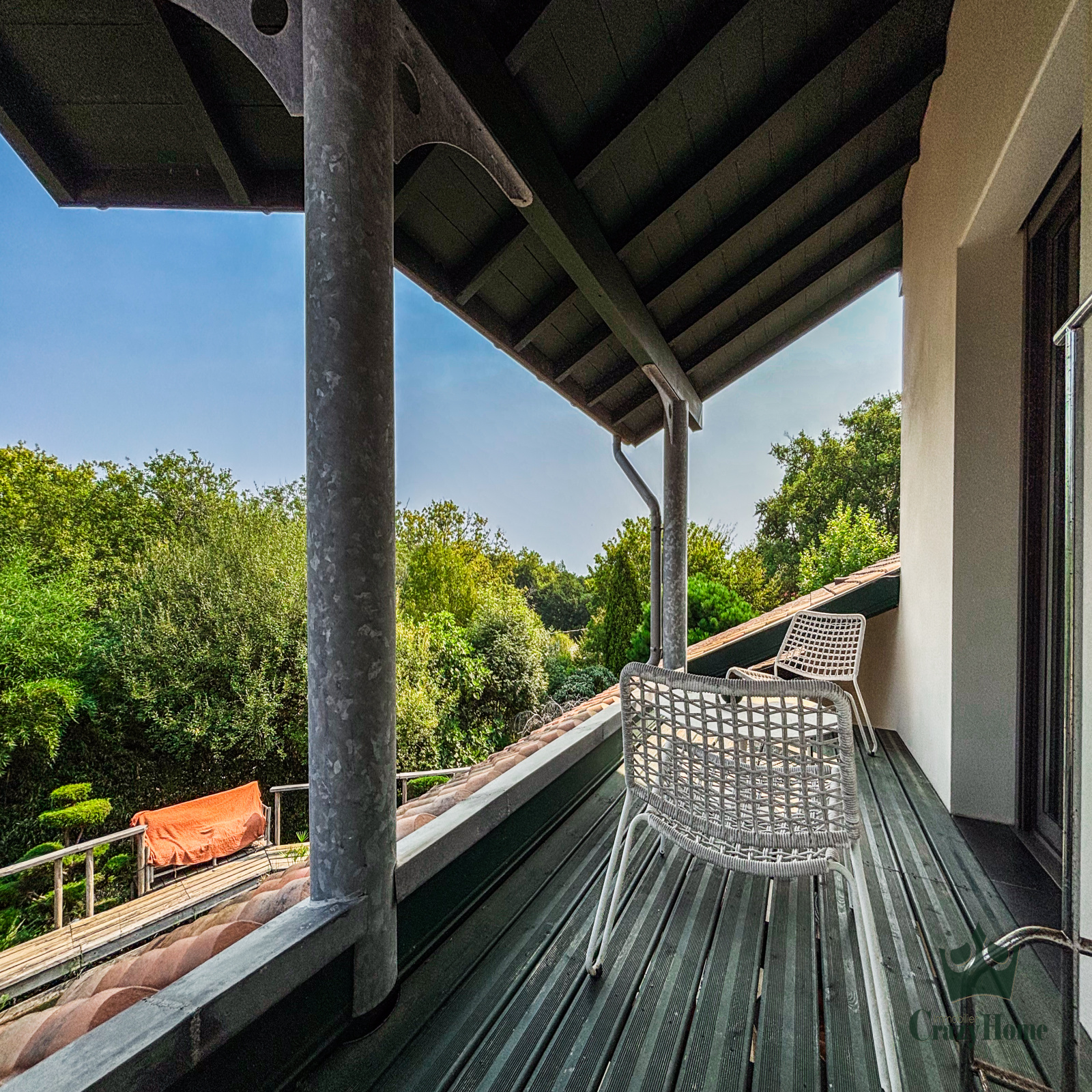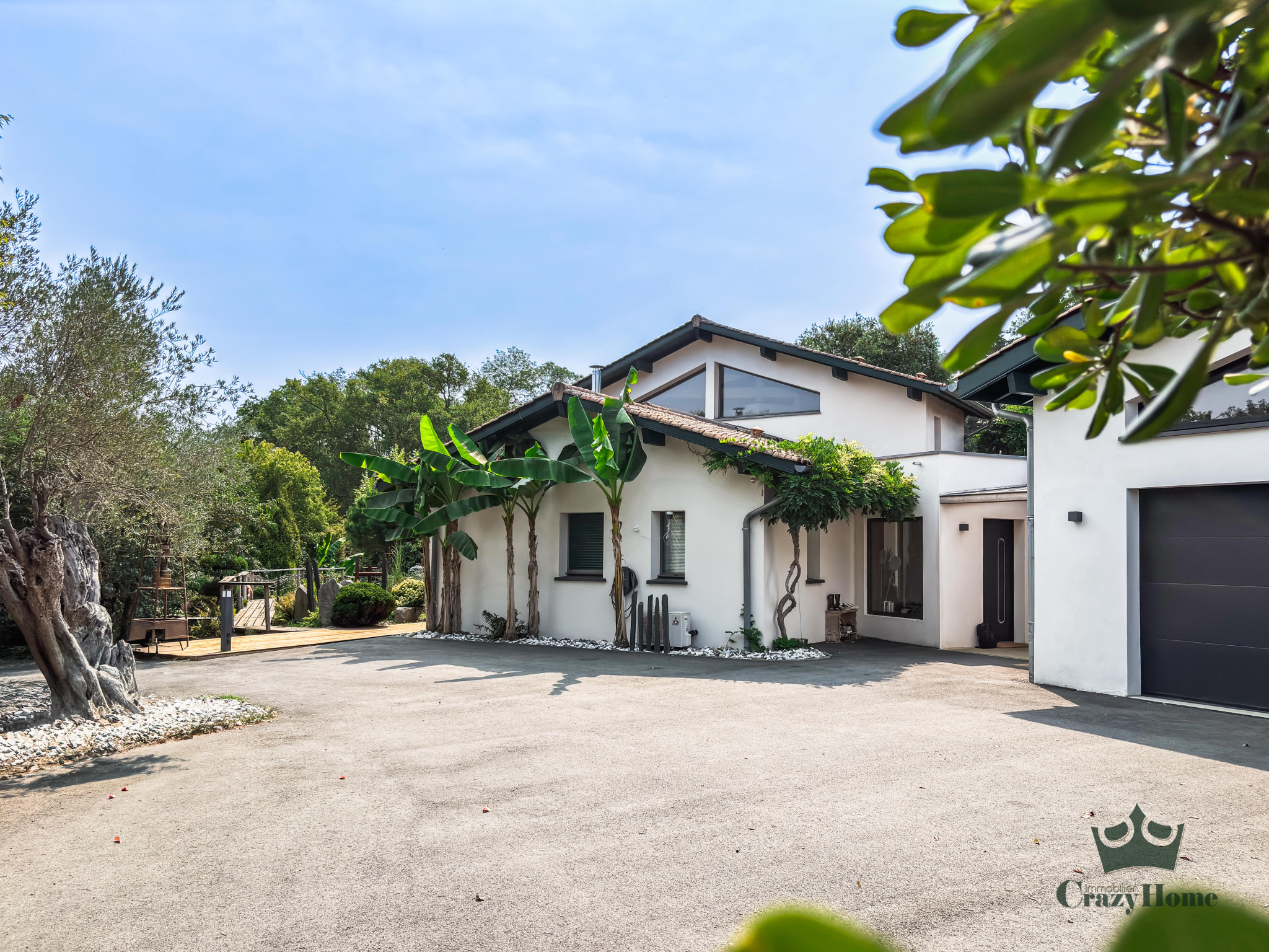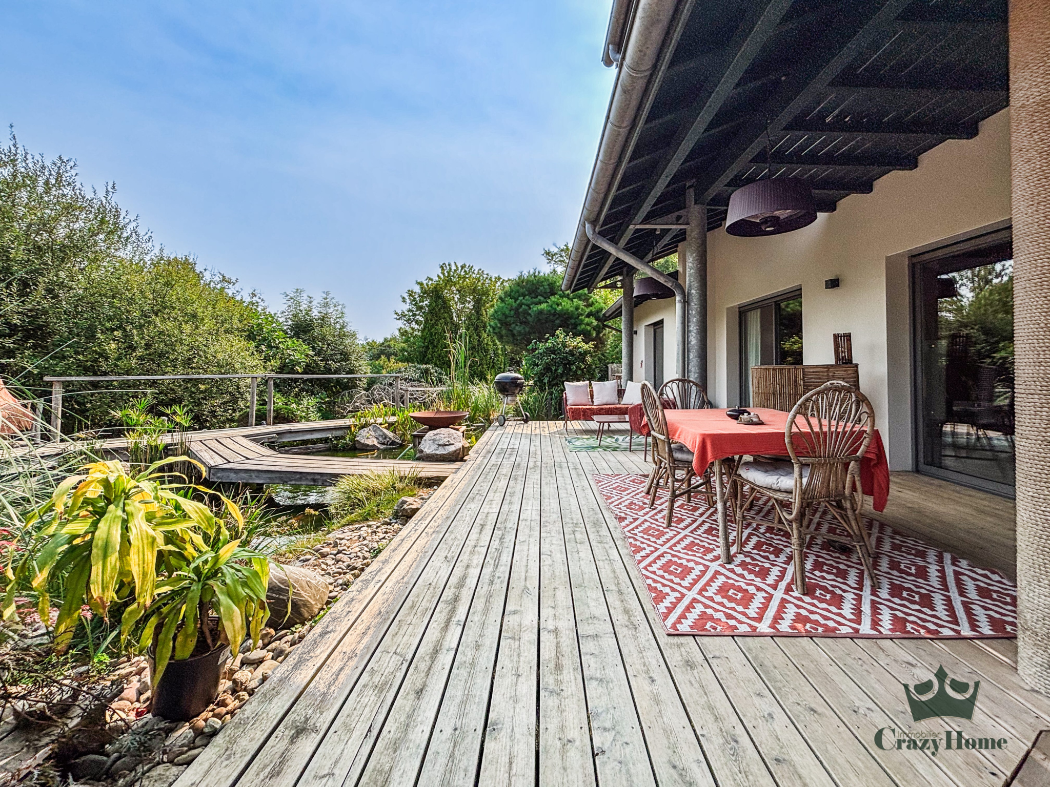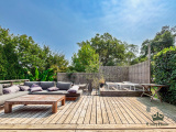 Côté extérieur : la maison assise sur une belle pacelle de plus de 1700 m² dans un environnement luxuriant avec son jardin d'inspiration japonaise aux essences diverses et variées, agrémenté d'un bassin naturel et d'une fontaine propice à la détente. Une bel espace salon d'extérieur, posé sur une terrasse bois pouvant accueillir une piscine, vous immerge dans ce havre de paix.